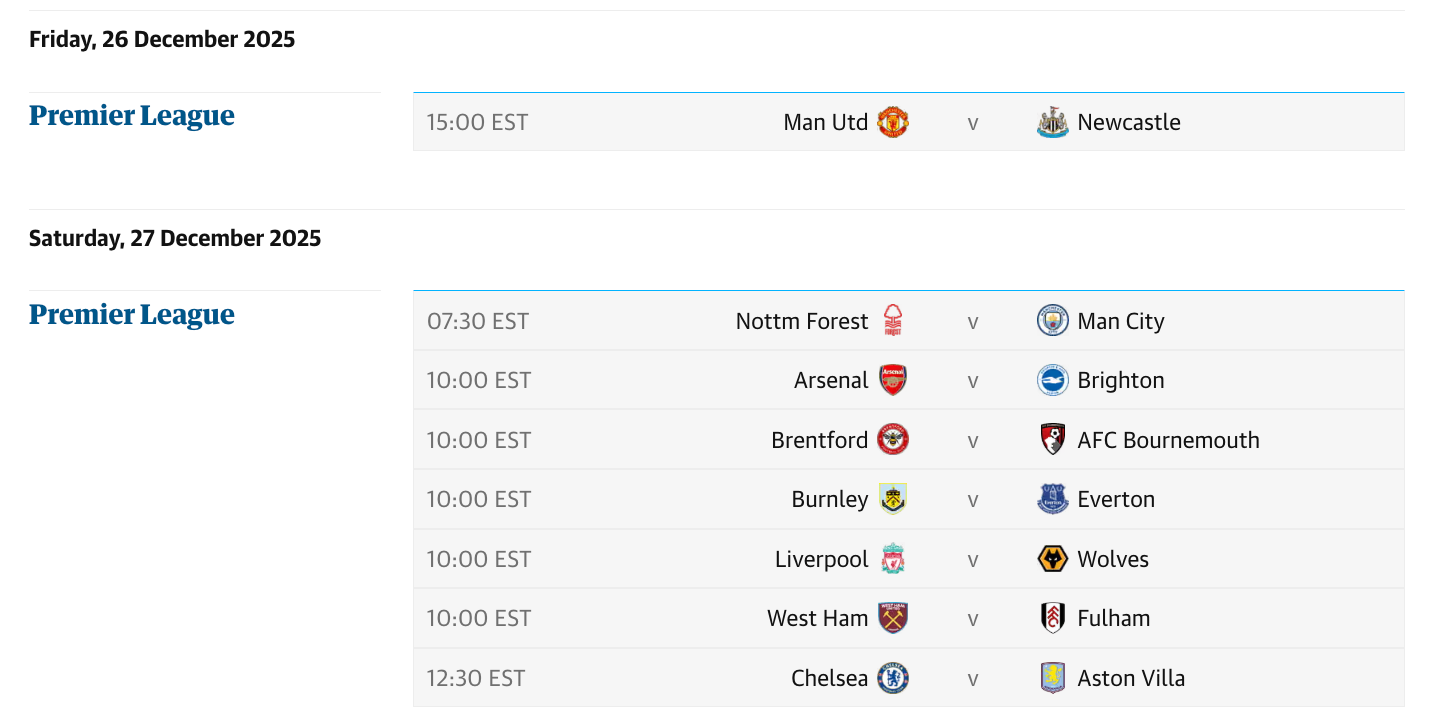 Players who played Sunday would be on five days’ rest for a Boxing Day fixture — like Man United’s, who play Boxing Day and will play again Tuesday on four days’ rest. Teams that play this weekend instead of Boxing Day will have less recovery time for the midweek fixtures.
